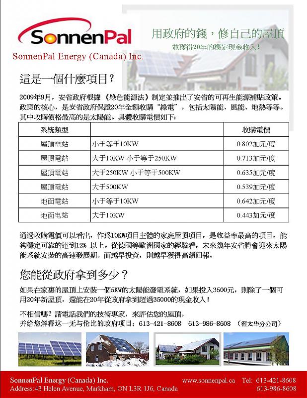 如果业主选择100%银行贷款,从并网发电的那天起,业主便开始与银行一起分享利润----这种形式,就相当于业主出屋顶,银行出资金,两者一起分享利润。业主的年收益率应为总贷款额的10%左右---赶快拿起电话咨询吧:Ottawa 分公司联络电话:613-421-8608,613-986-8608, Email: jian.ding@sonnenpal.ca