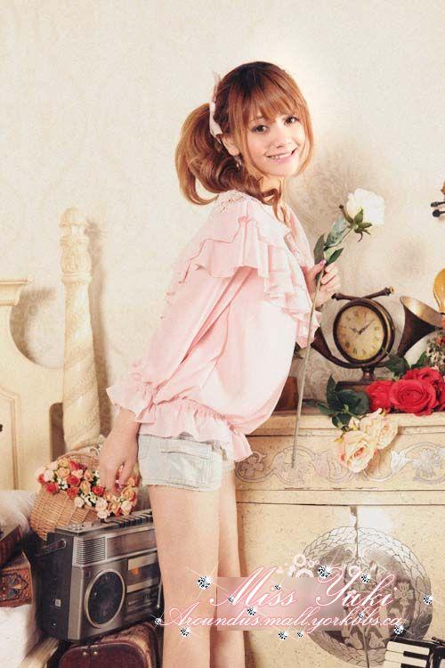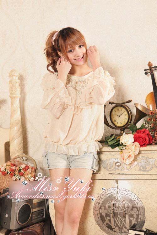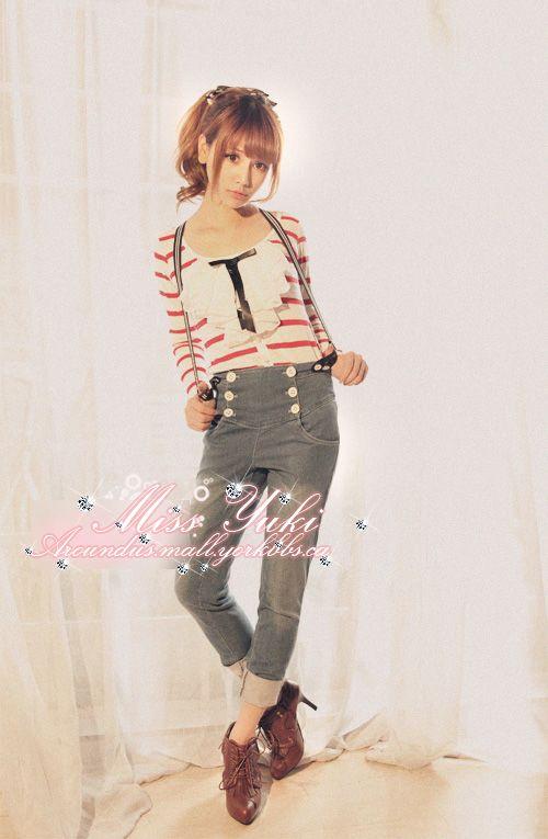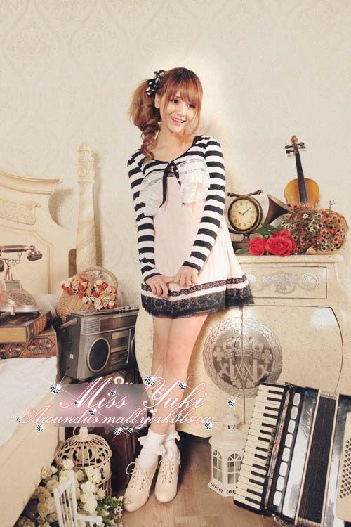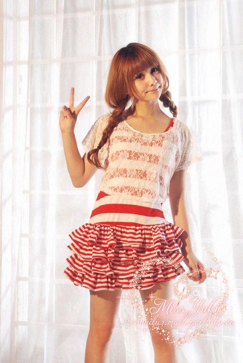 学院乖乖派 雪纺荷叶边条纹针织长T