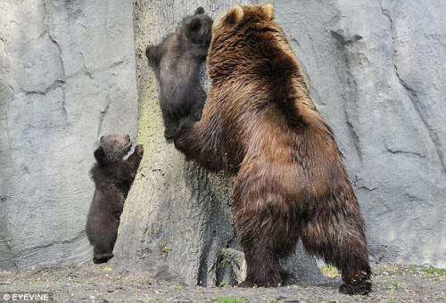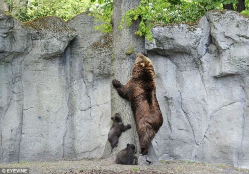 中新网5月6日电,据外媒报道,近日德国汉堡市的哈根贝克动物园上演了一出堪察加棕熊妈妈亲身示范幼崽如何上树的片段。