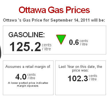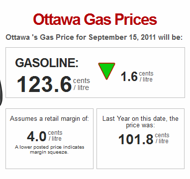 Tomorrow's gas prices for Ottawa will be: Gas: 125.8 (-0.8 cents/litre) Diesel: 119.9 (+0 cents/litre)