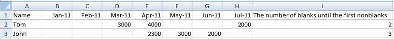 如下图所示, 1. Tom行上的“前置”空白单元格个数是2 (the number of blank cells until the first non-blank cell),尽管在F,G列上还有两个空白单元格。 2. John行上的前置空白单元格个数是3,经管在H列上有一个空白格。 我把这些结果列在了第 i 列上。 我的问题是:如何在 i 列上,用公式来计算前置空白单元格的个数? 感谢!