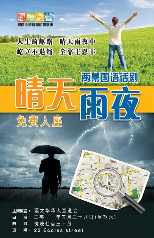 各位朋友: 我们诚挚邀请您携带家人与朋友来渥太華宣道会欣赏由恩语之声福音机构演出的国语话剧。免費入場。 时间:2011年5 月28日, 7:30 p.m. - 9:30 p.m. 地点:渥太華宣道会, 22 Eccles Street, Ottawa