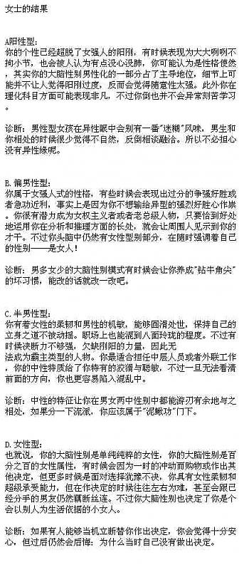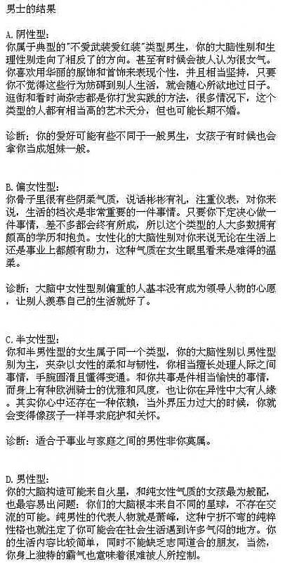 一位剑桥大学的教授最新研究表明,并非所有的男性都有一个典型的"男式"大脑。差不 多每五个男性中就有一个的大脑是"女式"的,这就是为什么有些男人会 喜欢芭蕾胜过喜 欢足球。反之,每七个女人中就有一个的大脑是"男式"的:擅长数学,喜欢分析和解决 复杂的问题胜过喜欢聊天逛街。刚生下一天的婴儿,大 脑就已经具有了不同于生理的独 特"性别"。你的大脑性别更偏于男性还偏于女性?