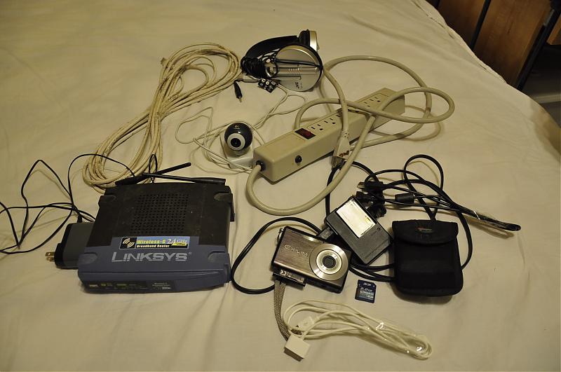 logitech 摄像头, $5 linksys router带wireless, $20 casio小相机,700万像素+2G SD card +其它配件, $30 ( sold ) 各种长度1米-10米, $1到$5 接线板, $3 apple 传输线, $3 jvc耳机, $3 psp go 传输线+充电, $5 联系方式,6138647066