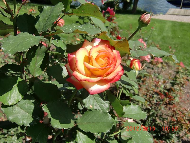我仔细观察了一下rose,发现它从根部出来了两种芽,一半明显是rose,枝干较粗,叶子颜色为深绿,枝干上有大刺。另外一半这是细一点的浅色枝干,叶子颜色也明显的浅,没有多少刺,我怀疑这部分就是蔷薇。我之前就没有仔细观察过这两部分的区别,以为是新枝叶所以颜色浅一些呢:blowzy:。这两部分今年都不曾开花。