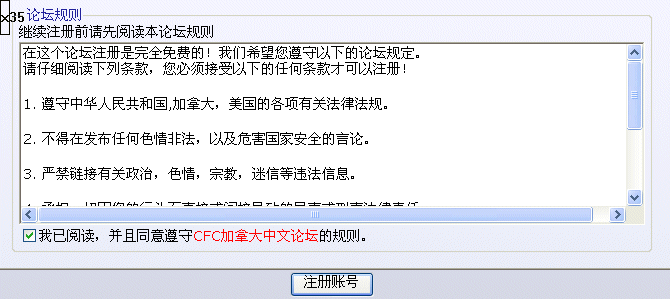 ccc 难得糊涂 管理成员 VIP 注册 2003-04-13 消息 238,372 荣誉分数 37,530 声望点数 1,393 2011-06-28 #34 http://bbs.comefromchina.com/register.php 在这个论坛注册是完全免费的!我们希望您遵守以下的论坛规定。 请仔细阅读下列条款,您必须接受以下的任何条款才可以注册! 1. 遵守中华人民共和国,加拿大,美国的各项有关法律法规。 2. 不得在发布任何色情非法,以及危害国家安全的言论。 3. 严禁链接有关政治,色情,宗教,迷信等违法信息。 4. 承担一切因您的行为而直接或间接导致的民事或刑事法律责任。 5. 互相尊重,遵守互联网络道德,严禁互相恶意攻击,漫骂。 6. 管理员及版主有权保留或删除论坛中的任意内容。 7. 本站管理员拥有一切管理权力。 附件 Image2.gif 27.9 KB · 查看: 92