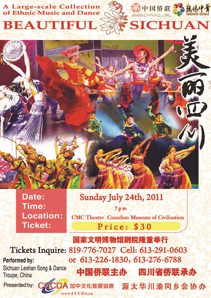 四川乐山歌舞团将于本月24号来到渥太华表演 时间:2011年07月24日(周日) 7:00P.M. 地点:文明博物馆(Theatre Canadian Museum of Civilization) 门票:$30刀 电话:6138510294