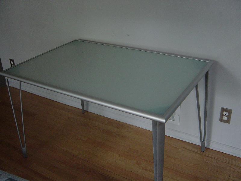 现有玻璃桌子一张。因为买了新的桌子,这张就多余了。