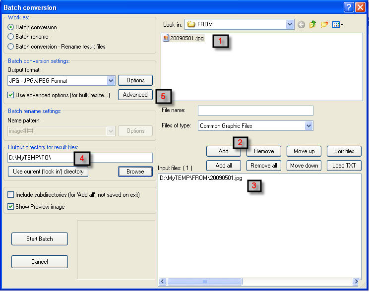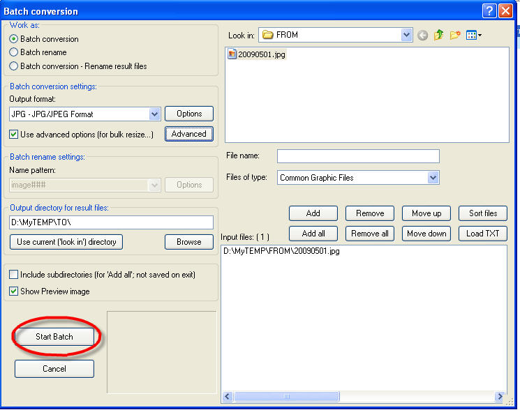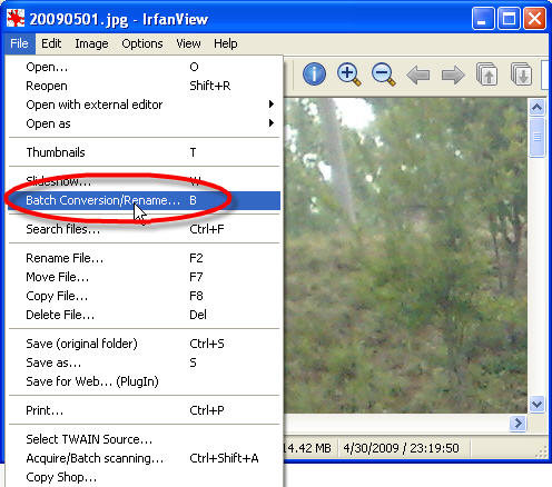 用 free irfanview 把图片改小的简单步骤: 1) 原图 20090501.jpg 的大小为 2592x1944。 论坛不许贴这么大的图 2) 选择 File --> Batch Conversion/Renaming