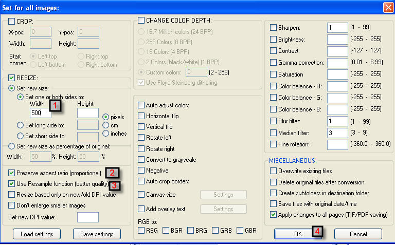 3) 五步: (1 )选图(可以多选); (2) 点 ADD 或 ADD ALL (3)要改的图LIST (4)选择把改小的图放哪; (5) 点击 ADVANCED 4) 决定把图改多小 (最简单的设置: 长 500点,并保持长宽比例)
