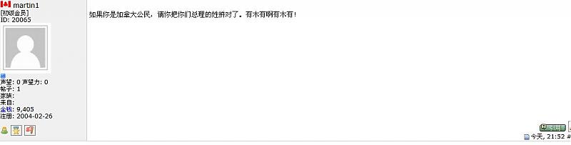 ccc 难得糊涂 管理成员 VIP 注册 2003-04-13 消息 238,268 荣誉分数 37,508 声望点数 1,393 2011-07-22 #23 martin1 说: 如果你是加拿大公民,请你把你们总理的姓拼对了。有木有啊有木有! 点击展开... 资深就是不一样。唯独的一帖纠错。