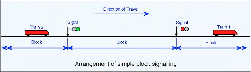 Railways are provided with signalling primarily to ensure that there is always enough space between trains to allow one to stop before it hits the one in front. This is achieved by dividing each track into sections or "blocks". Each block is protected by a signal placed at its entrance. If the block is occupied by a train, the signal will display a red "aspect" as we call it, to tell the train to stop. If the section is clear, the signal can show a green or "proceed" aspect.