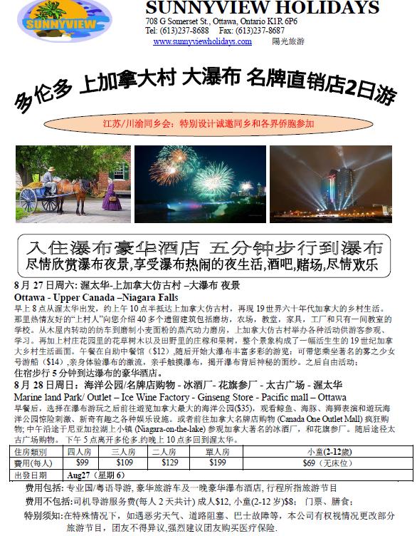 江苏和川渝同乡会诚邀同乡和各界侨胞参加安省二日团游(8月27日-28日) 。注:还有空位。