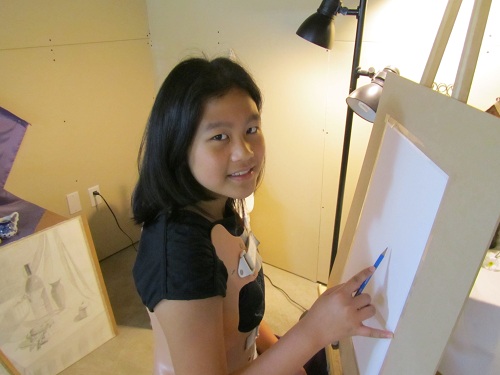 路老师看在眼里,急在心里。因为路老师知道女儿离考入艺术高中需要参加面试的时间不多了;路老师更清楚女儿需要补好多的课才能去应付有相当难度的面试和考试;如果为了这次绘画比赛花去太多宝贵时间的话,那么以后将会面临时间更紧迫的问题。然而女儿一心要要拿出她最佳绘画作品参加比赛的决心已定,她硬是脱掉了每天需要穿在身上的硬塑料背心来专心画画(因为穿着背心坐着画画会很难受,背心底部掐在大腿上感到疼痛,坐姿无法到位)。还有因为她的肌肉松弛和骨关节疼痛,很难做到抬起手臂绘画。我看着很是心疼……