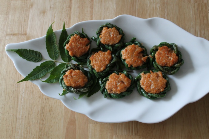 辣子鸡和酿三文鱼饼。