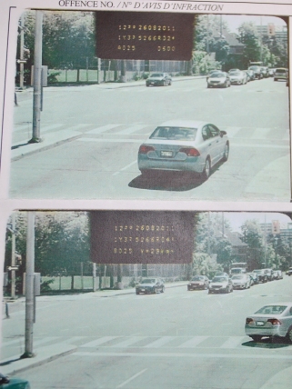谢谢所有的热心CFC网友回帖,我要求上庭,最近得到法庭通知,那个case警方撤了。但是以后肯定是要注意的,算是有惊无险的一次教训。 在BRONSON往南右转上CARLING 被拍。第一张红灯2.6秒,第二张红灯4.1秒。已经记不清了,不过我看1.5秒内车没走多远(第二张上还有个车尾)。所以我想上庭式一下。申辩中间我停过。请有经验及过来人指点一下,不胜感激。
