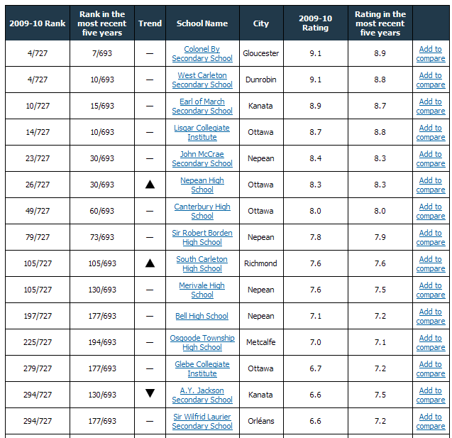 请问渥太华卡尔顿地区的高中排名情况
