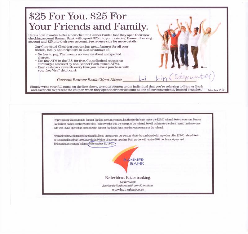 从即日到18 NOV, 如果你开户还可以得到USD 25,我也有25美元。如果你说是 LI LIN (edgewater) 介绍的,你可以自行打印,在银行主页有一个referal。