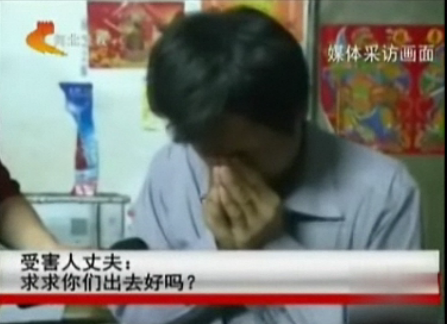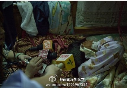 不止一家媒体,直接进入杨武家门,堵住躺在床上,已经有精神失常迹象的妻子,要求对方回答隐私问题,床上堆着话筒,女人穿着睡衣,蜷在床上,身体往后缩,掩住自己的脸。
