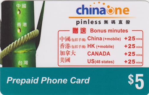 CHINAONE电话卡 $5面值仅售4.5 拨打中国电话305分钟 无各种隐藏费用 可与手机或家庭电话连接,无需每次输入密码。 购买请联系613-986-4988 欢迎上门自取1339 Meadowlands Dr. E.