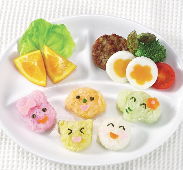 大号饭团模具5件套装 20刀 商品内容】小熊、星星、花朵、三角、爱心5种造型一套。 本款为大号饭团,做出的饭团宽度约7.5~ 8.5cm,厚度5cm左右。 【使用方法】①用饭勺模具舀米饭; ②盖上盖压紧米饭;(压紧的时候用手hold住饭勺底部) ③摁压饭勺底部,倒出成型的饭团即可。 【使用注意】①商品本身不含饭团表情,本店还有多款表情模具配合。 ②图中饭团的各种颜色的做法,可以用各种蔬菜汁配水煮米饭,这样不但可以做出各种颜色的饭团,还很有营养。 ③耐热温度为-10~120℃,请尽量不要开水烫洗。用清洁剂清洗就好。