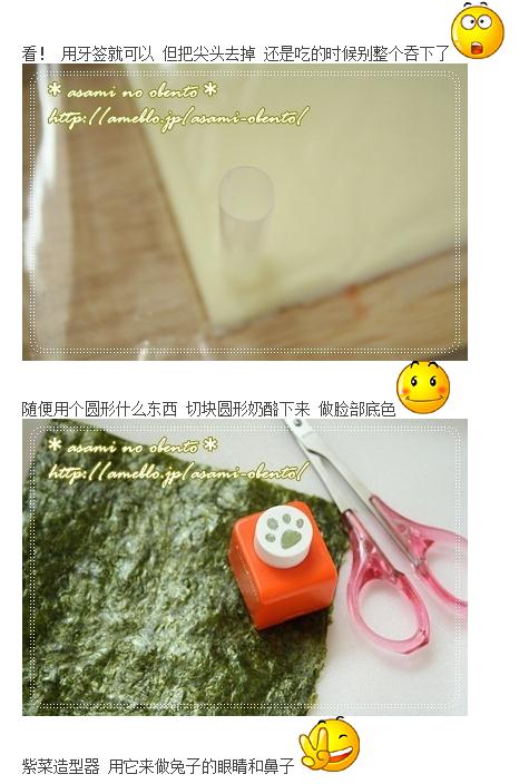 我真想给孩子们做这个,除了小孩子喜欢,做起来也好像很有意思啊~就怕忙起来不能天天坚持,可孩子们有了期盼,哪天打开饭盒一看不是这么精心准备的了,会不会失落啊~真纠结~要不要只在特殊的日子做一下?:blowzy: