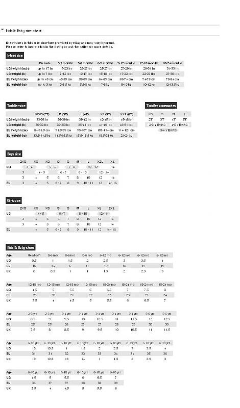 相信很多新妈妈跟我一样,都对小盆友们衣服鞋子的size感到困惑。我在eBay找到一个链接里面有所有size的解释,希望对大家有用: http://pages.ebay.com/sell/sizechart.html