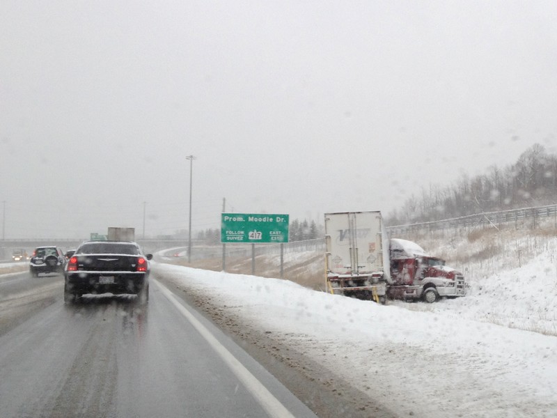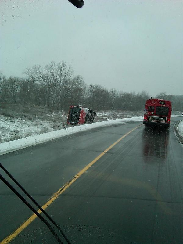It looks like an OC Transpo bus. There is also a full-length trailer truck in the ditch on 416 North, close to Moodie Dr and the 411. 来了个烧鸡大弯脖。 Borrowing a photo from Riven.