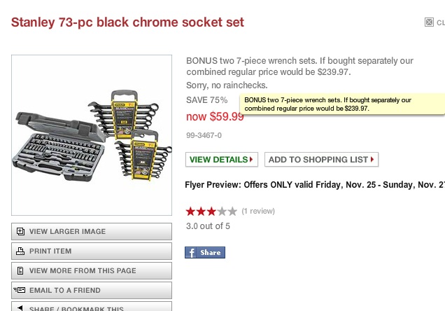 http://www.canadiantire.ca/AST/browse/6/Tools/Sockets/SocketSets/PRDOVR~0589235P/Mastercraft+233-piece+Socket+Set.jsp?locale=en 我有一套这个, $99买的.老觉得盒子设计有问题, 一不小心里面的东东都掉出来了.要复原怎么都的半小时. 这周从homedepot买了一套$39makita的drill bits,里面有3个adapters, 可以接这些sockets, 总算如了心愿 . 这周末有两样超值的工具, 一是$29 GRADE2的 FIBER梯子, 还有就是$99的roybi impact 和compact的18v LI电钻,曾经拥有过,强力推荐.