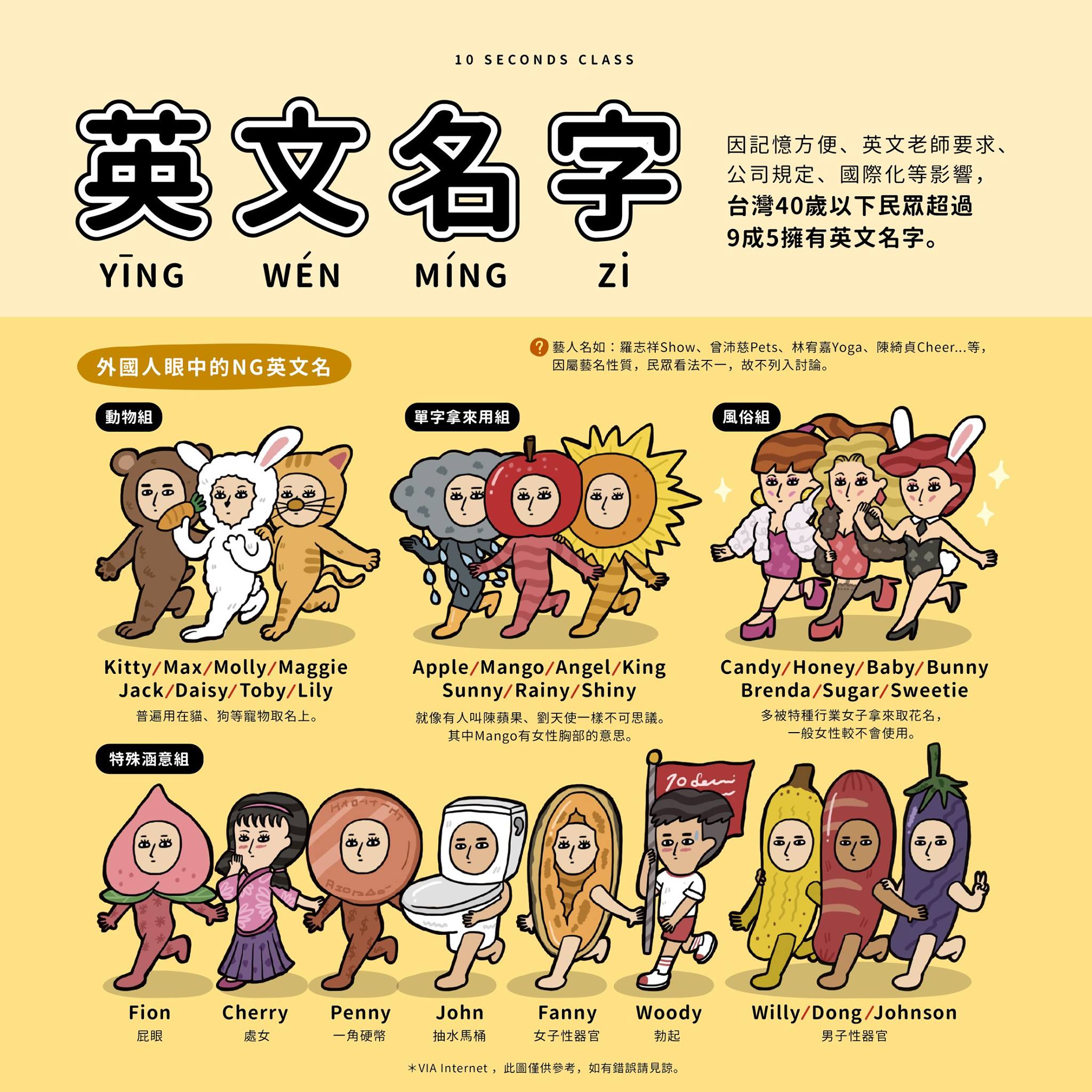 你有英文名字嗎?你有想過自己的英文名字還有什麼意思嗎?擅長用插畫圖表呈現議題的粉專「10 Seconds Class - 10秒鐘教室」日前整理了外國人眼中的NG英文名字,並將這些名字分為4組,讓網友趕緊查看自己名字有無上榜。