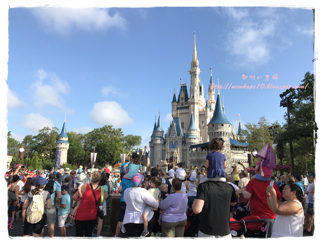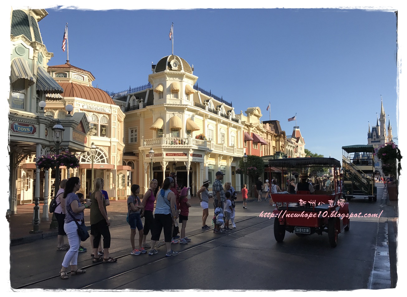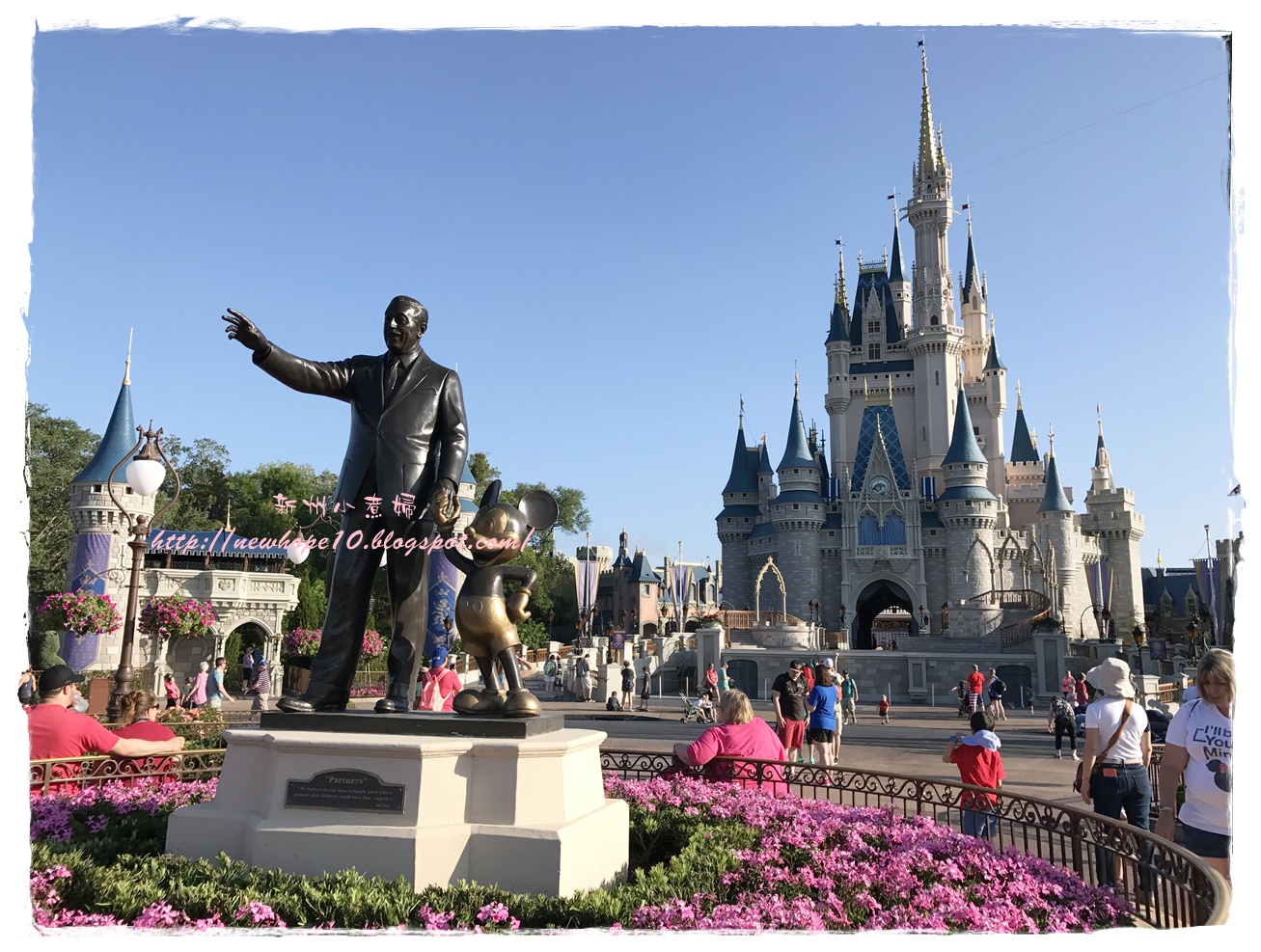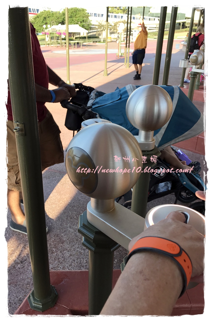 吃完早餐後約7:45 AM準備來去搭接駁車,住在迪士尼飯店有個好處就是接駁車多、又很早就開始了,我們這間飯店是7:30開始接送,這間飯店到Magic Kingdom大概20-30分鐘車程,到了以後還要走一小段路到門口驗票(magic band),建議可以開園前30-40分鐘就到園區內,這樣可以先慢慢悠閒的拍拍照,先走到城堡旁各區的入口等,通常工作人員都會在每個園區入口拉起一條線,等九點後米奇和公主們出來唱歌迎接大家後就可以衝了~