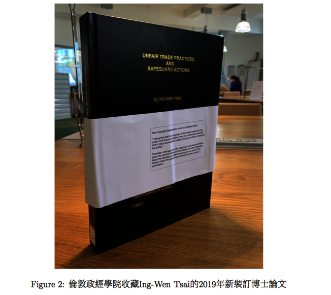 LSE網站上的備註:這份論文是蔡英文提供的個人拷貝於2019年6月建檔,論文的首頁和其他的頁數中,沒有任何考試官(Examiners)的簽字或簽收日期。為什麼LSE可以讓一篇論文在35年後登入圖書館目錄,我沒有答案,圖書管理員也無法回答,有待LSE校方解釋。