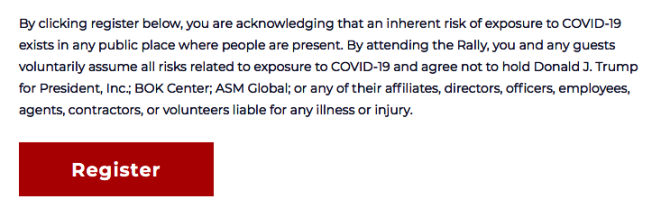 根據川普的競選活動網站,要參加活動得事先上網登記,留下姓名、電子郵件、手機號碼與居住州別,一個手機號碼可註冊兩張入場券,在按下報名鍵之前,有段文字顯示「確定報名表示您認知到,每個人在公共場合都存在暴露於新冠病毒的既有風險,您參與競選活動,都自願承擔所有暴露風險,並同意不因任何身體不適或傷害,而要求川普競選團隊、土爾沙體育館(BOK Center)、活動公司(ASM Global)等相關單位負責。