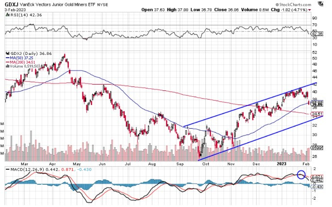 我依然不觉得黄金的长期投资逻辑有任何变化,下周会公布中国央行的外汇储备,看看1月份中国有没有持续加仓黄金吧。GDXJ今天跌了近5%,跌破了37.5的支撑位,如果看GDXJ从去年9月底以来的上升趋势通道,GDXJ是有可能砸到33附近的,距离现在也就是10%左右,耐心等待这一轮暴跌的动能过去,黄金今年还会有大机会。