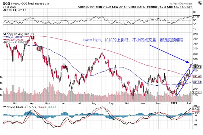美国经济数据,强就一个字,非农数据不出意料的强劲,全面碾压预期,这和近期的JOLTS的大幅增长相呼应;昨晚的AAPL AMZN GOOG的季报都有不及预期的地方,盘后这几个公司的股票都出现大幅下跌的,叠加今天超预期的非农数据,QQQ盘前一度大跌2%,可市场表现出了它的韧劲,开盘后一路不停拉升,QQQ一度从下跌2%转绿,市场的强劲可见一斑,但最终午盘后股指不断下跌,今天最终三大股指均收跌,QQQ跌了1.77%。今天非农数据后,3月加息25基点的概率已经接近98%,5月加息25个基点的概率也接近60%,这对市场的中期走势绝对谈不上是好消息。下一周美联储官员密集发言,很难想象他们会保持鸽派,纳斯达克在上涨20%以后,有点走的太快太猛,也许它还能冲上320,但对我来说RISK/REWARD已经不是很合适了,我没有按照之前的计划当QQQ跌破298止盈,而是今天清仓了所有的指数多仓,从12月19日初始建仓到今天全部清仓,平均盈利约25%,这也就是自己的能力边界,再往上也不是我能力范围能能够吃到的利润,继续观察市场学习实践。其实我也意识到虽然纳斯达克日线图有点高,周线图却并不高, 美国经济似乎没有衰退的风险,今天的ISM PMI又佐证了这一点,强劲的劳动力市场、复苏的经济,给投资者描绘的应该是一个偏乐观的画面,这也是美股可以继续上冲的动力.