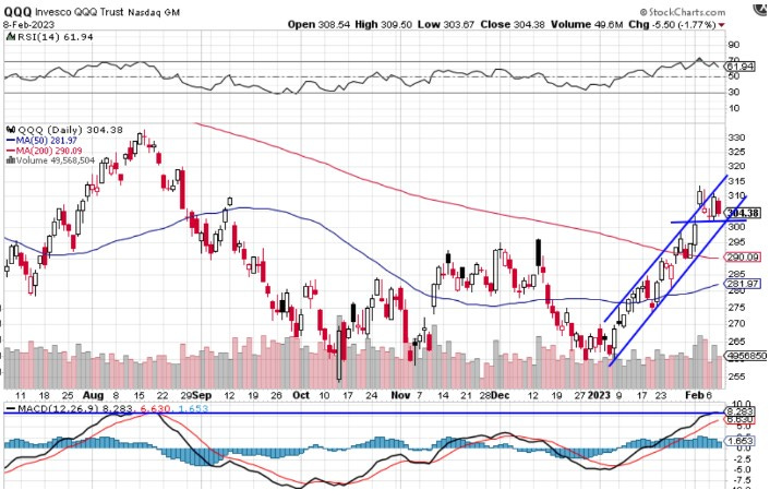 技术图形上看QQQ显得没有方向,多头可以认为美国经济可以避免软着陆,而且美联储加息到了尾声阶段,空头认为当前的利率环境对于经济的伤害并未完全显现,而且先行的货币政策依然是非常紧缩的,而通胀是否得到有效控制还需要时间来验证。看了一些经济数据显示去年12月份的二手车价格又意外上涨了,通胀究竟是一路下行还是会有波折现在真的不好判断,下周二就会有最新的CPI数据,届时牛熊要可能会根据公布的CPI数据分出胜负,之前市场没有方向,近5个交易日里QQQ大部分时间都是在302-310之间做区间震荡。如果CPI、核心CPI如期下行,市场很可能会继续走高,而任何的意外都会让市场陷入恐慌,市场的情绪还是非常脆弱的。