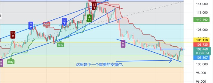 美元指数:在昨天回调后今天小幅上涨,依然在近期的阻力区间,并未形成突破。美联储加息周期可能比预期的更久,但同时世界其它央行的加息表态都弱于美联储,比如加拿大央行就明确表示暂停加息,而英格兰央行、欧洲央行的近期表态也都被解读位鸽派,这个大环境下,美元有更多的理由是上涨而非下跌,我保持美元会在调整后突破近期阻力区间的观点。