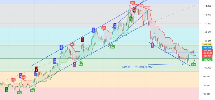 美元指数:美元指数今天冲高回落,收了一根小阴线,总体上升趋势也没什么变化,103.5是美元指数的强支撑,105左右美元指数有一个明显的阻力位。短线调整后美元指数还会走高,至少应该会去测试105的关键阻力位。