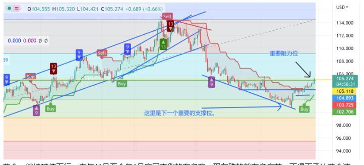 美元:终于来到了我们目标位105.2,这种小幅突破并不能说明这是一个可靠的技术性突破,还需要观察几天,但技术图形的作用在这一轮美元反弹上还是表现的非常精准的。即便加息周期里,美元可能因为美联储超预期的强硬而受益,但美元作为国际储备货币,还是要看全球对美元的使用意愿以及是否有新的替代体系。俄乌战争后,看到美国将美元武器化,全球范围内许多国家都在减少对美元的依赖,但此时此刻还是不得不捏着鼻子用,同时也害怕随时自己的美元资产瞬间就改名换姓了,所以我们看到世界很多央行都买黄金替代美元,还有些超高净值人群也是这么做的;同时美国金融市场大幅下跌,使得投资意愿大幅降低,这也使得美元的投资需求在降低,这些对美元需求的降低并不会随着美联储的政策变化而变化。还有传闻说今年金砖国家要扩容,之后就是在这些国家内部形成一套独立的贸易结算体系,这对美元来说也是釜底抽薪的一招,而主导这件事的恰是中俄。短期是的,美元随着美联储加息预期的增加而保持强势,但中长期,美元正掉进美国自己挖的洞里。