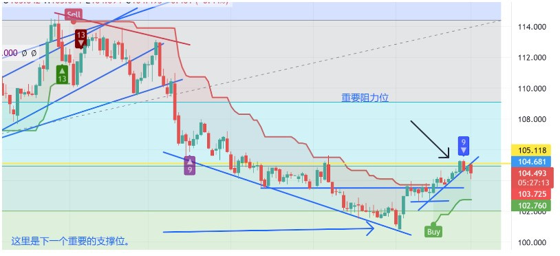 美元指数:昨天美元弱势反弹,今天又掉头向下了!今天英国那里出消息,英国央行未来不会激进加息,但是虽然美元兑英镑是涨的,但美元指数还是出现大幅下跌,跌幅接近0.5%。其中主要的原因是中国昨晚公布了PMI数据,超级靓眼,全面碾压预期,说明中国经济解封后还是快速回暖的,真的,中国这样的经济基础、这样的消费能力、这样的拼搏意识,只要自己不折腾,经济大概率都会是好的。所以人民币大涨、港股大涨、美元也因此大跌。可以看到一个趋势就是中国经济恢复的较为顺畅、而美国在紧缩货币政策下经济恢复之路坎坷,而资本逐利的性质很可能会出现追逐低估值的港股、A股,而撤出美股。当然了,这是在亚太安全的情况下,谁知道这样的安全能否长久呢。美元指数很可能会回撤103.5的技术支撑位,目前日线图是LOWER HIGH,LOWER LOW,这样的趋势非常像一个短期头部的成型。