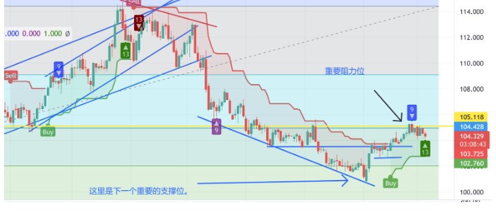 美元指数:进一步调整,今天又跌了0.2%,美元指数在3次尝试105.2的阻力位没有突破的情况下,进一步下调的概率非常大,我依然紧密关注103.5附近的支撑位,美元指数很可能短期去测试该支撑位。